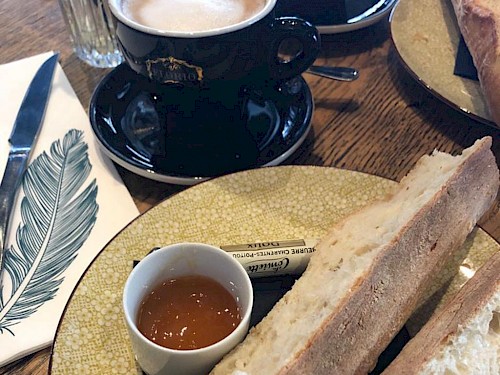 08.30 Uhr aber erst auf ein Café au lait und ein Baguette im Café Bar du Moulin.