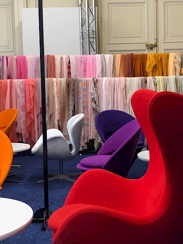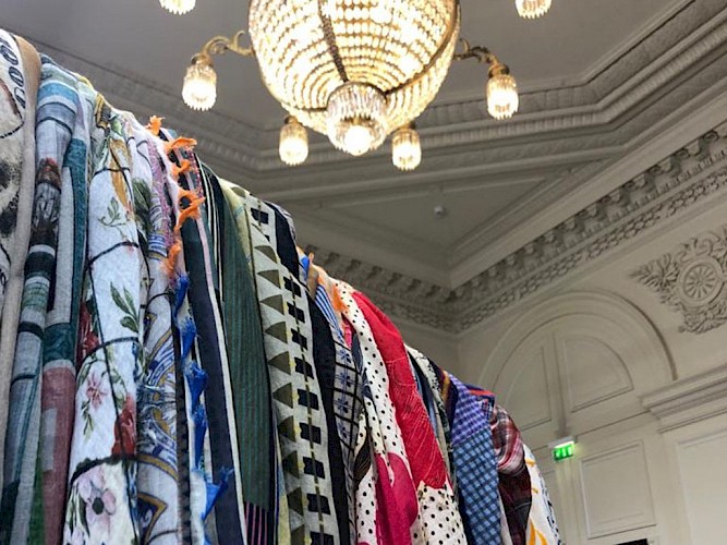 Nach einem Fussmarsch zum Palais de la Bourse treffen wir um 11.15 Uhr bei Faliero Sarti ein. Faliero Sarti gehört zu den klassischen Schmuckstücken der europäischen Mode. Ein Sarti Schal um den Hals drappiert, ersetzt auf kunstvolle Art das Collier. Sarti ist Fashion pur und wird in New York, London, Tokio ebenso gesichtet wie in Paris. Stylisten und Fashionfans haben Faliero Sarti schon lange für sich entdeckt.